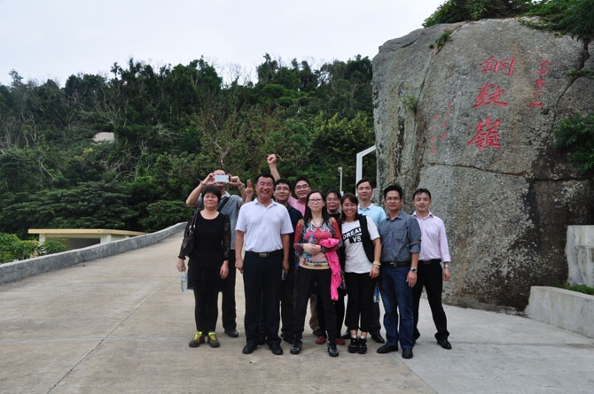 素有“琼东第一峰”的铜鼓岭主峰海拔338米,山路蜿蜒曲折,三面环海,地貌奇特,植被繁茂,为爬山登顶造成了一定的阻碍。尽管如此,在刘董的带领下,大家不畏艰苦、勇敢攀登、沿山路逐级而上,终于成功登顶。