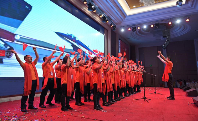 ▲刘景萍董事长与广西维威管理团队一起合唱《尊龙凯时,向前进》